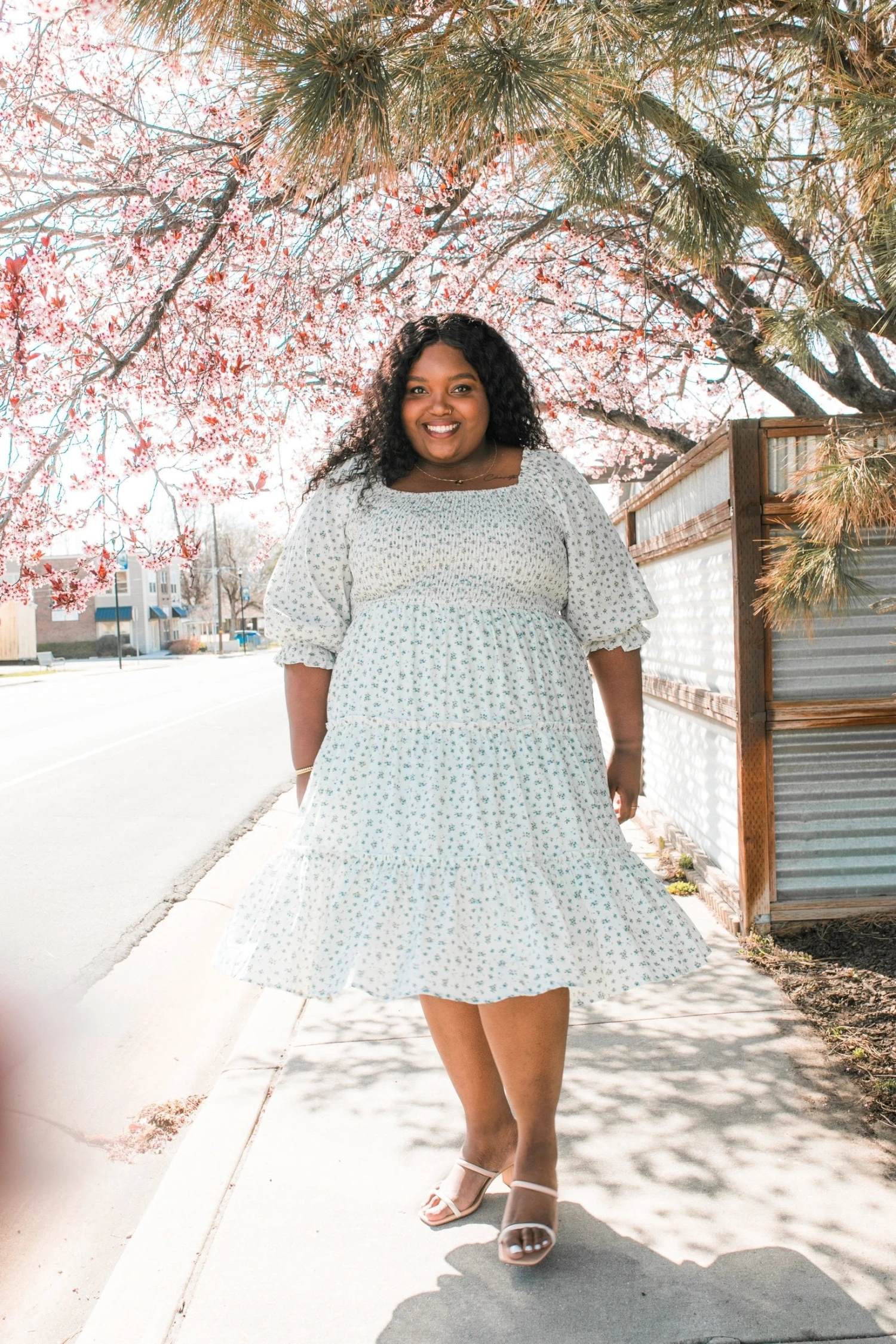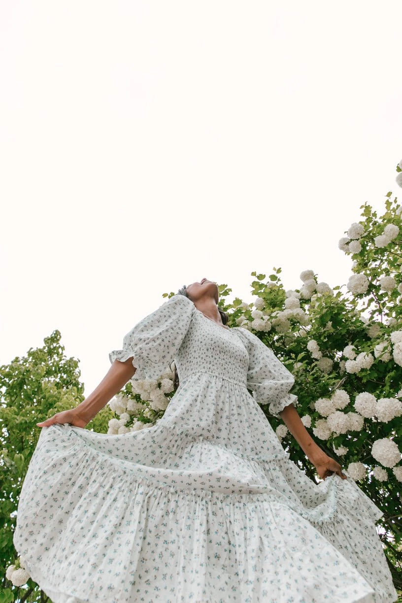 blue floral puff sleeve smocked midi dress